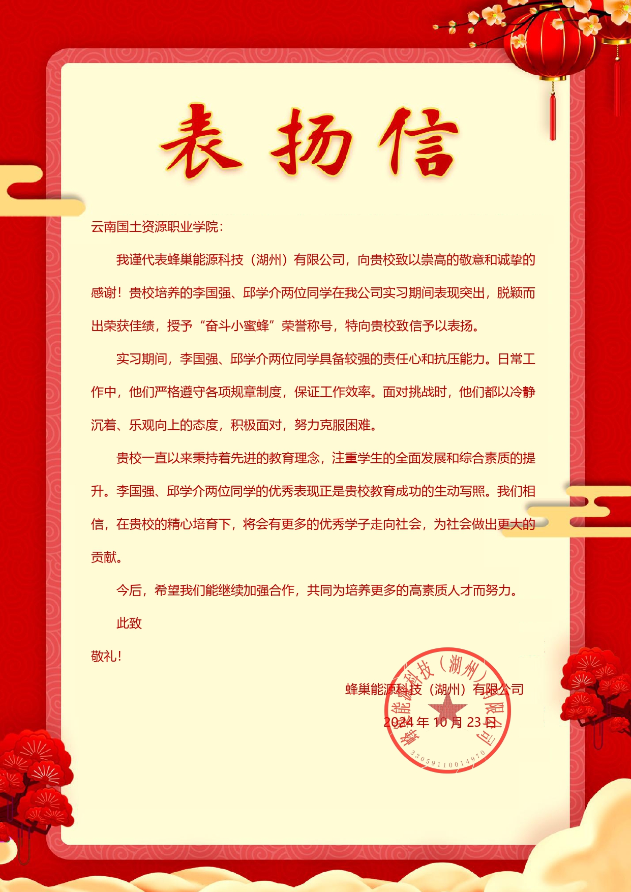蜂巢能源科技(湖州)有限公司致我院实习学生的表扬信