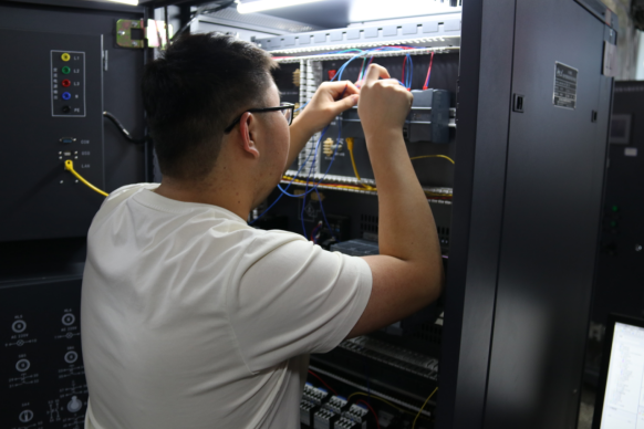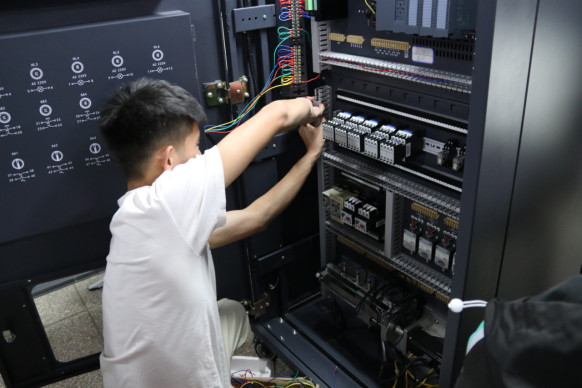 比赛现场,各队选手沉着冷静、娴熟操作,用每一个电路的连接来展示自己扎实的功底,用每一个功能的调试来展示自己的专业技能水平,高效地运用所学知识技能,高质量地完成每一项操作步骤,展现了机电学子拼搏向上的精神面貌和“精益、专注、创新”的工匠精神。