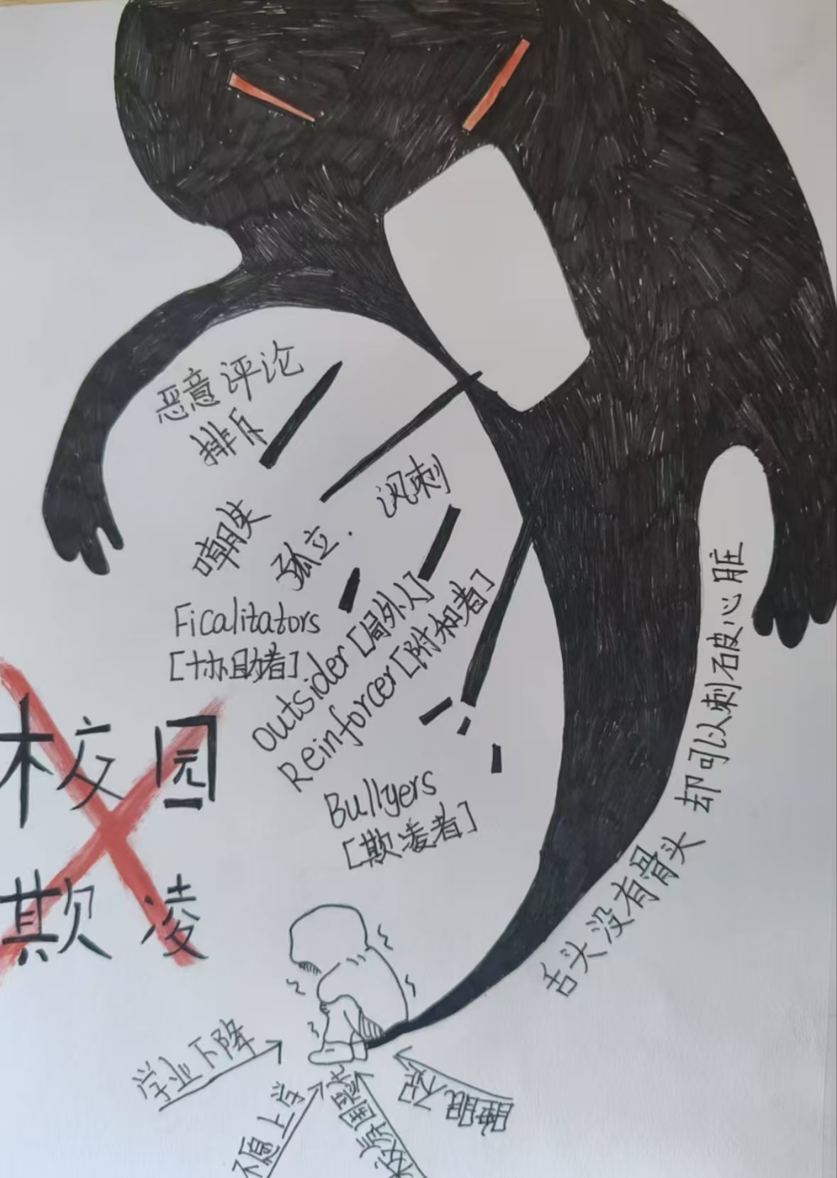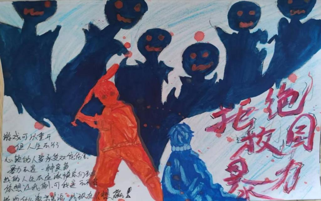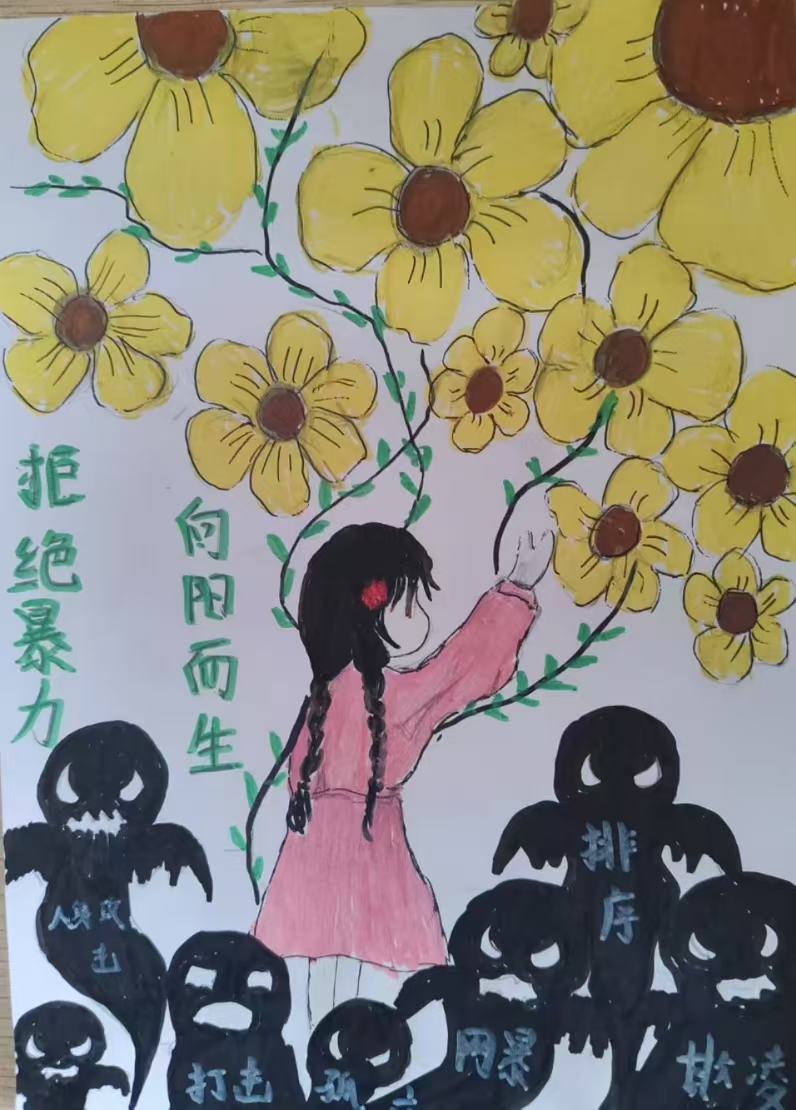 在活动过程中,同学们充分展现了自己的想象力和创造力,通过漫画、海报的形式,创作出了一幅幅生动的绘画作品。有的同学运用鲜艳的色彩,以直观而强烈的视觉冲击,描绘了校园欺凌的多种表现形式,如言语侮辱、肢体冲突、关系欺凌等;而有的同学则采用了细腻入微的画法,通过精心雕琢的细节,传递出深刻的情感,展现出了同学们团结一致对抗欺凌、互帮互助的美好愿景。