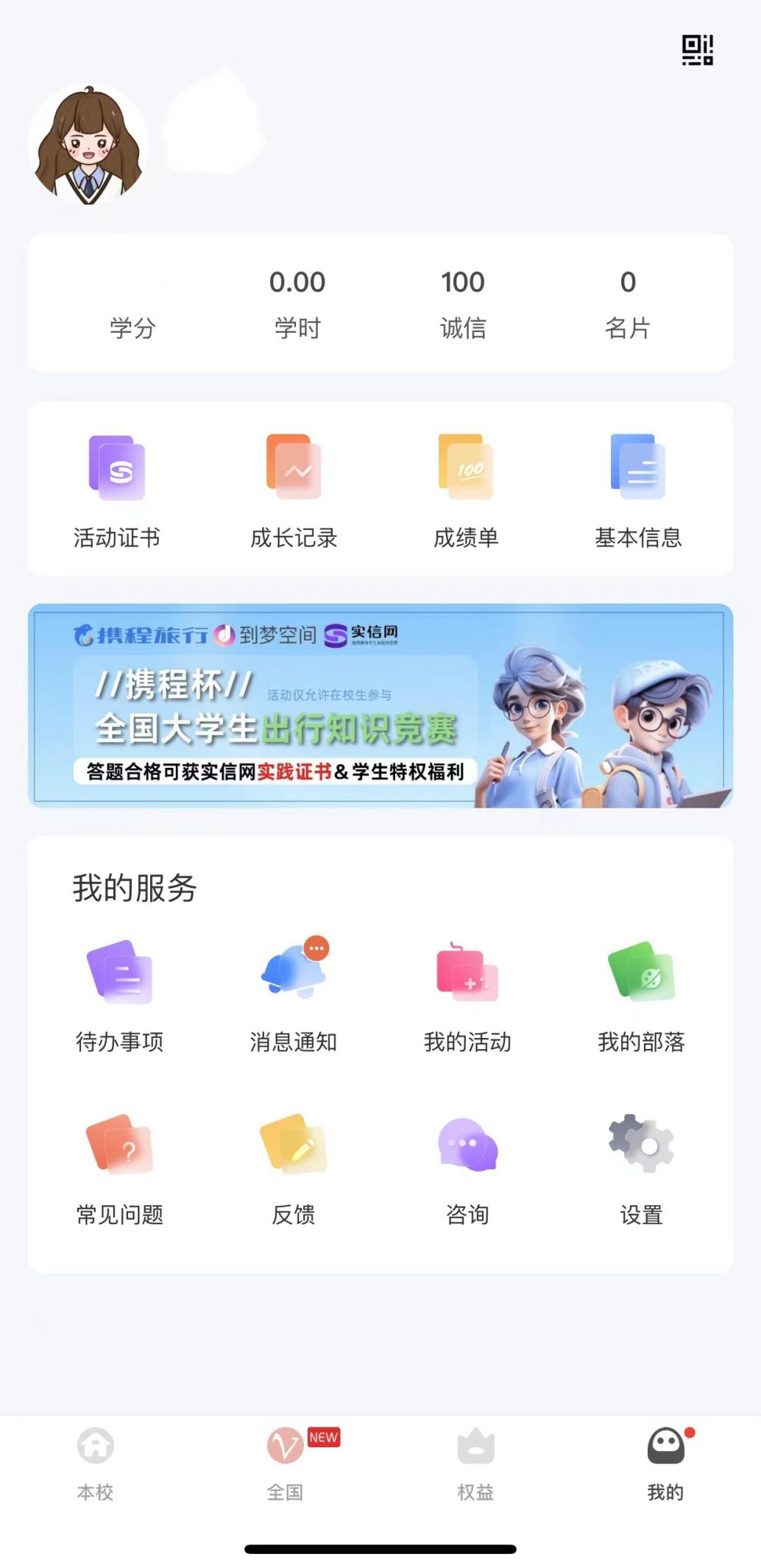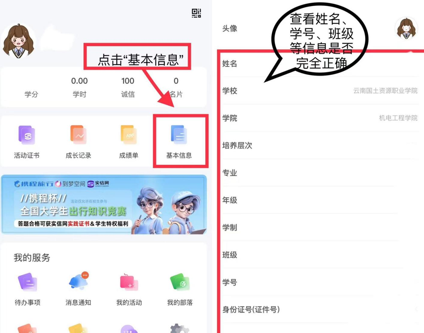 登录成功后,进入【我的】页面,检查相关信息。若基本信息完全正确,则激活成功;若有错误,请联系学院二课负责人进行处理。