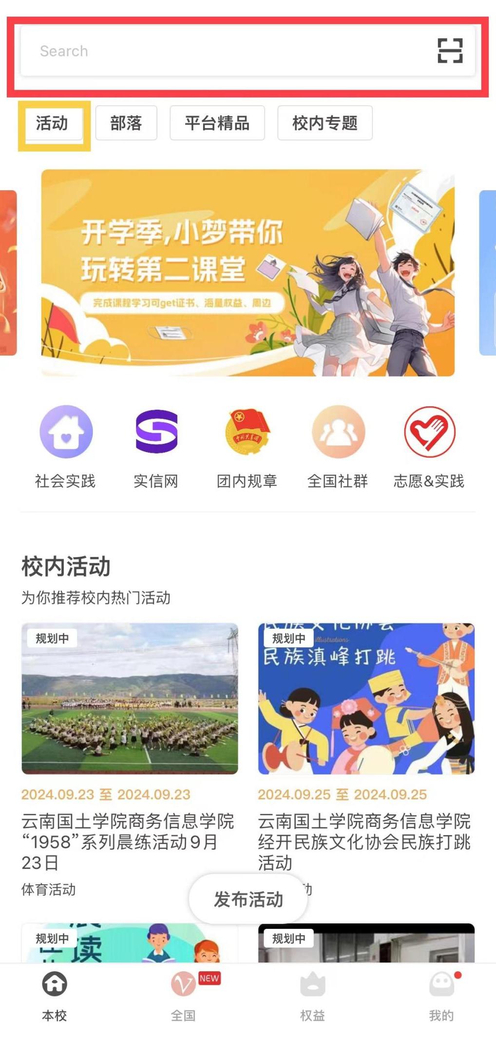 检索区域:支持本校活动、部落的检索,可以查看全部的活动(其中可按自己的需求进行筛选可参与的活动)、部落列表, 查看待办事项,进行活动扫码等。在下方导航栏点击【本校】,即可查看本校各单位发布的精彩活动(最多显示2-6个)