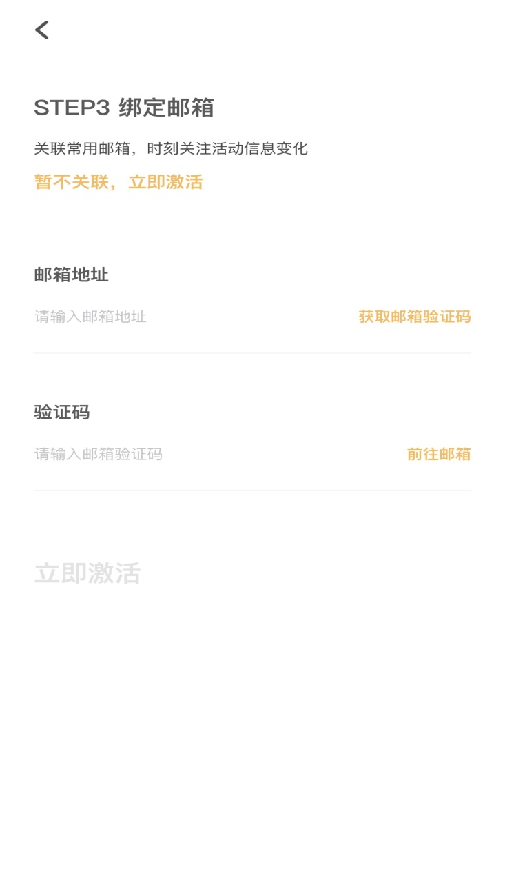 绑定邮箱:可以点击暂时跳过,直接激活登陆。如需绑定需要输入邮箱地址点击获取验证码判断是否可用。(由于QQ邮箱部分功能限制问题,为防止收不到验证码问题建议使用其他邮箱,可在APP跳转至邮箱进行验证)。