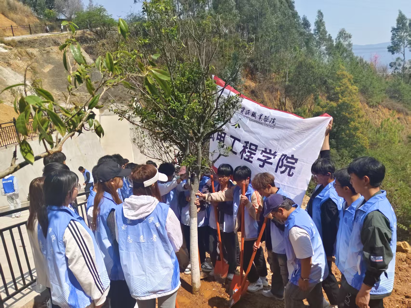 实践战场:东门隧道工程实训基地旁边,在校团委的带领下,学院志愿者们正投身于热火朝天的植树活动。抵达基地后,志愿者们迅速分组,默契协作。挥锹铲土的动作刚劲有力,扶正树苗的姿态小心翼翼,提水浇灌时脚步匆匆却又沉稳有序,每一个步骤都认真细致,一丝不苟。在众人齐心协力之下,一棵棵树苗稳稳扎根于沃土,在轻柔的春风中舒展身姿,为实训基地披上了一层充满希望的新绿。