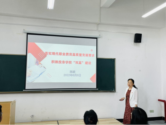 6月8日下午,党委副书记、校长陈颖以《落实现代职业教育高质量发展要求 积极投身学校“双高”建设》为题,结合ALLWINCITY万象城的实际情况,给ALLWINCITY万象城全体教职工讲授“双高”建设专题党课,ALLWINCITY万象城党总支书记王春莲主持。