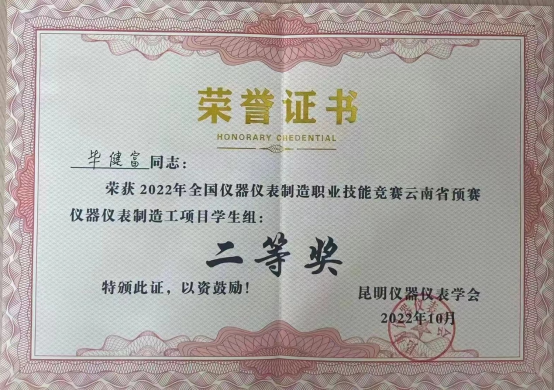 2020级智能控制1班唐周霞、毕健富荣获2022年全国仪器仪表制造职业技能竞赛云南省预赛仪器仪表制造工项目(双人赛)学生组二等奖,指导老师王强卫、崔庆权获优秀指导教师。